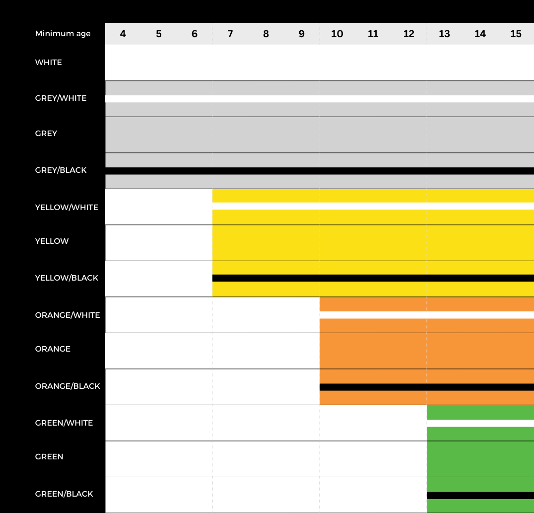 We award the corresponding coloured rank signified with a wristband of that colour and a certificate of achievement.